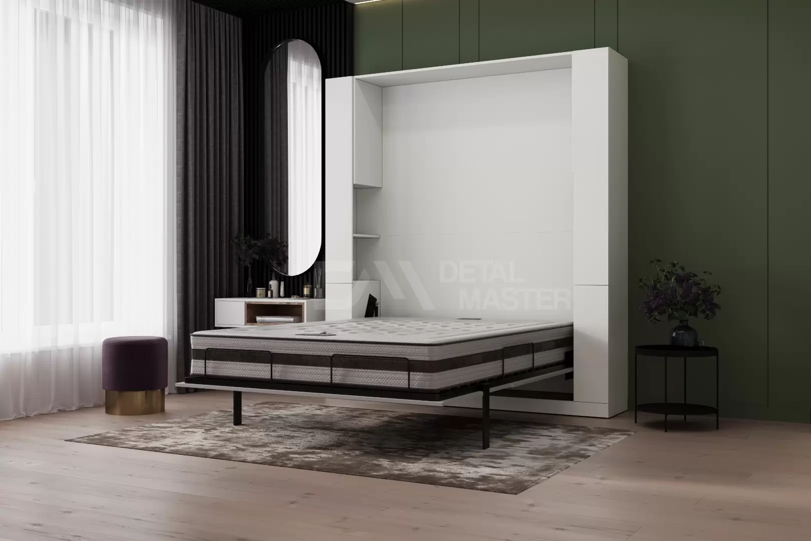 Шкаф-кровать трансформер с диваном "Nova Balance 2.0" работает на механизме раскладывания собственной разработки "Balance". Кровать раскладывается легким движением руки, превращаясь в полноценное спальное место. Просто потяните за ножку-маятник, которая самостоятельно фиксируется в нужное положение при опускании.